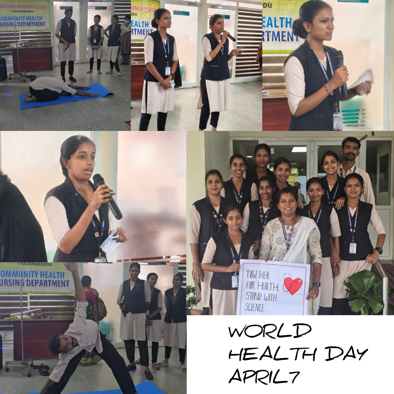 വെഞ്ഞാറമൂട് : ശ്രീ ഗോകുലം നേഴ്സിംഗ് കോളേജിലെ കമ്മ്യൂണിറ്റി ഹെൽത്ത് നേഴ്സിംഗ് ഡിപ്പാർട്ട്മെന്റിന്റെ നേതൃത്വത്തിൽ ലോകാരോഗ്യ ദിനാചരണം ശ്രീ ഗോകുലം അർബൻ ഹെൽത്ത് സെന്റർ ആറ്റിങ്ങലിലും, വാമനപുരം ഫാമിലി വെൽഫെയർ സെന്ററിലും നടത്തി. രണ്ടാം വർഷ പോസ്റ്റ് ബേസിക് ബിഎസ് ഇ വിദ്യാർത്ഥികൾ വിവിധ വിഷയങ്ങളിൽ ബോധവൽക്കരണ ക്ലാസുകൾ സംഘടിപ്പിച്ചു. ജീവിതശൈലി രോഗ നിയന്ത്രണം, വ്യായാമത്തിന്റെ ആവശ്യകത, ആഹാര ക്രമീകരണം, യോഗയുടെ പ്രാധാന്യം, പ്രതിരോധ കുത്തിവെപ്പുകളുടെ പ്രാധാന്യം എന്നീ വിഷയങ്ങളാണ് ബോധവൽക്കരണത്തിൽ ഉൾപ്പെടുത്തിയത്.